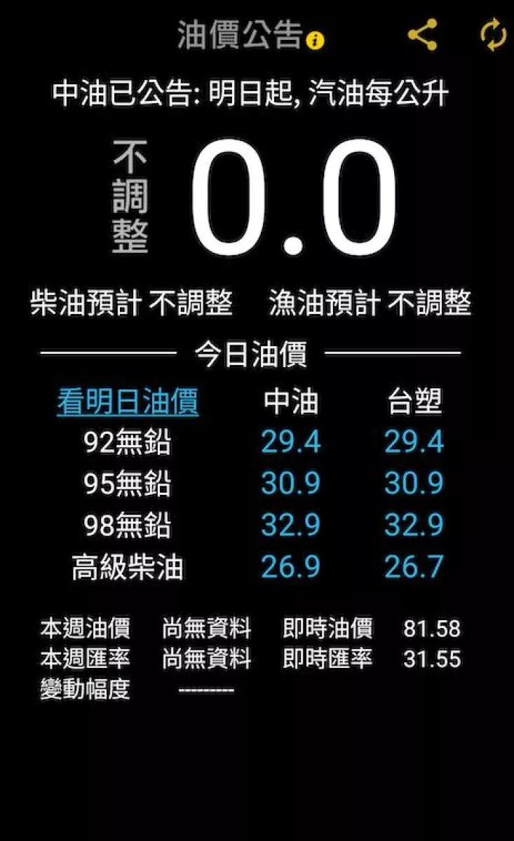 本週汽柴油價格不變⛽中油公告,確定本週汽柴油價格皆不調整;