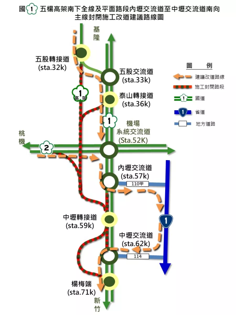 2.行駛於國道1號南下平面路段之用路人,請於內壢交流道出口匝道駛離國道後,在110甲(中原路)南行轉至台1線,往西續行114線(民族路)至中壢交流道再接回國道1號。