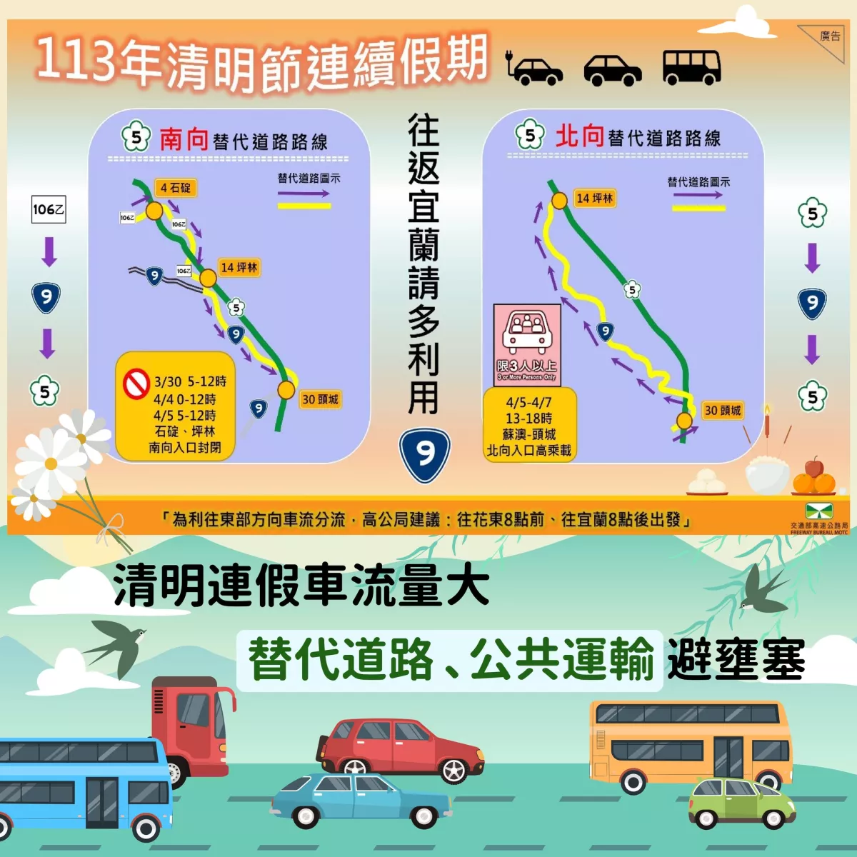 國5車流量大,尖峰時段請留意❗清明節連假4/4~4/7往東部地區的朋友要留意囉