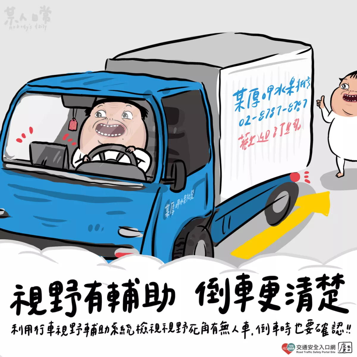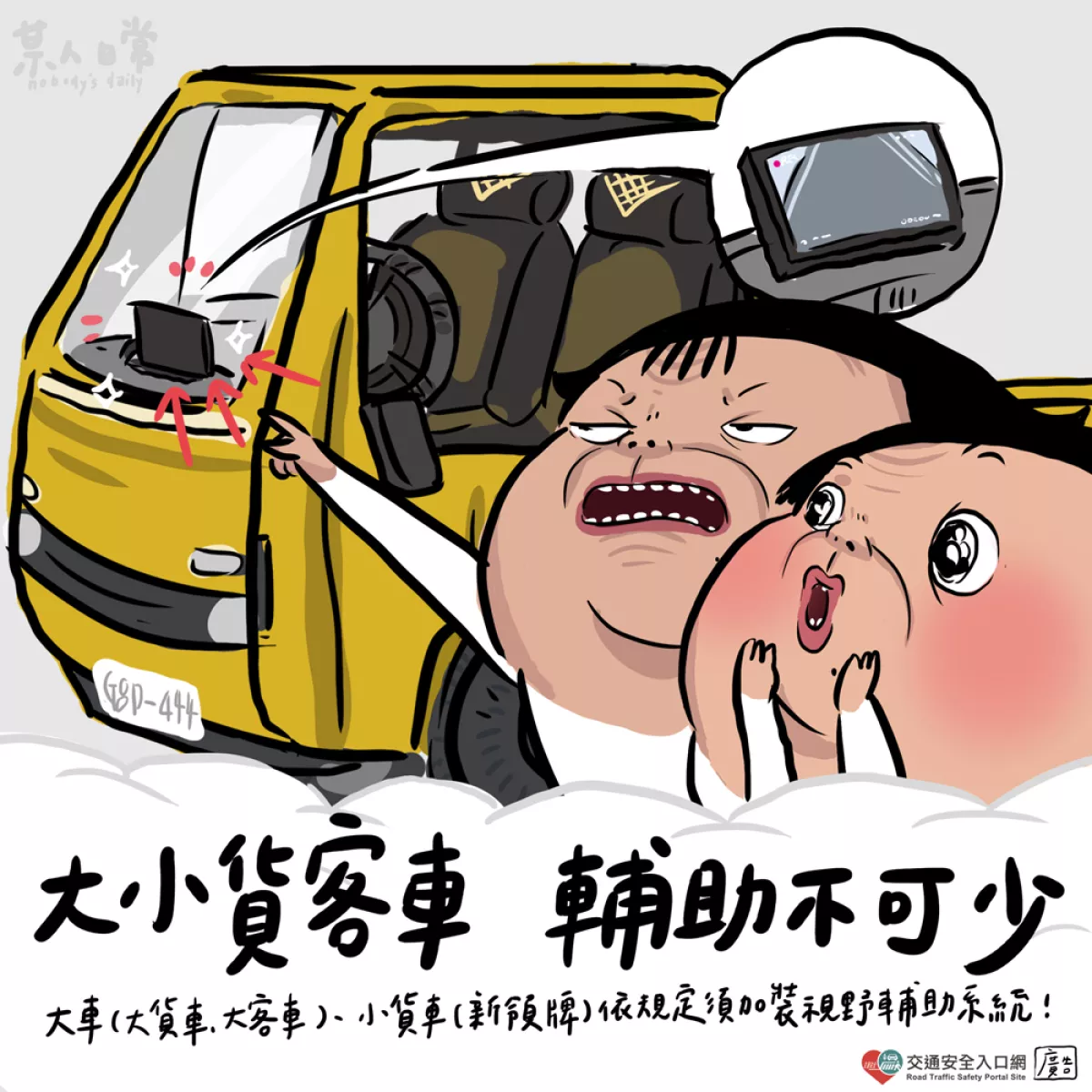 大車(大貨、大客)、小貨車(新領牌)依規定須加裝視野輔助系統,利用行車視野輔助系統檢視視野死角有無人車,倒車時也要確認😊