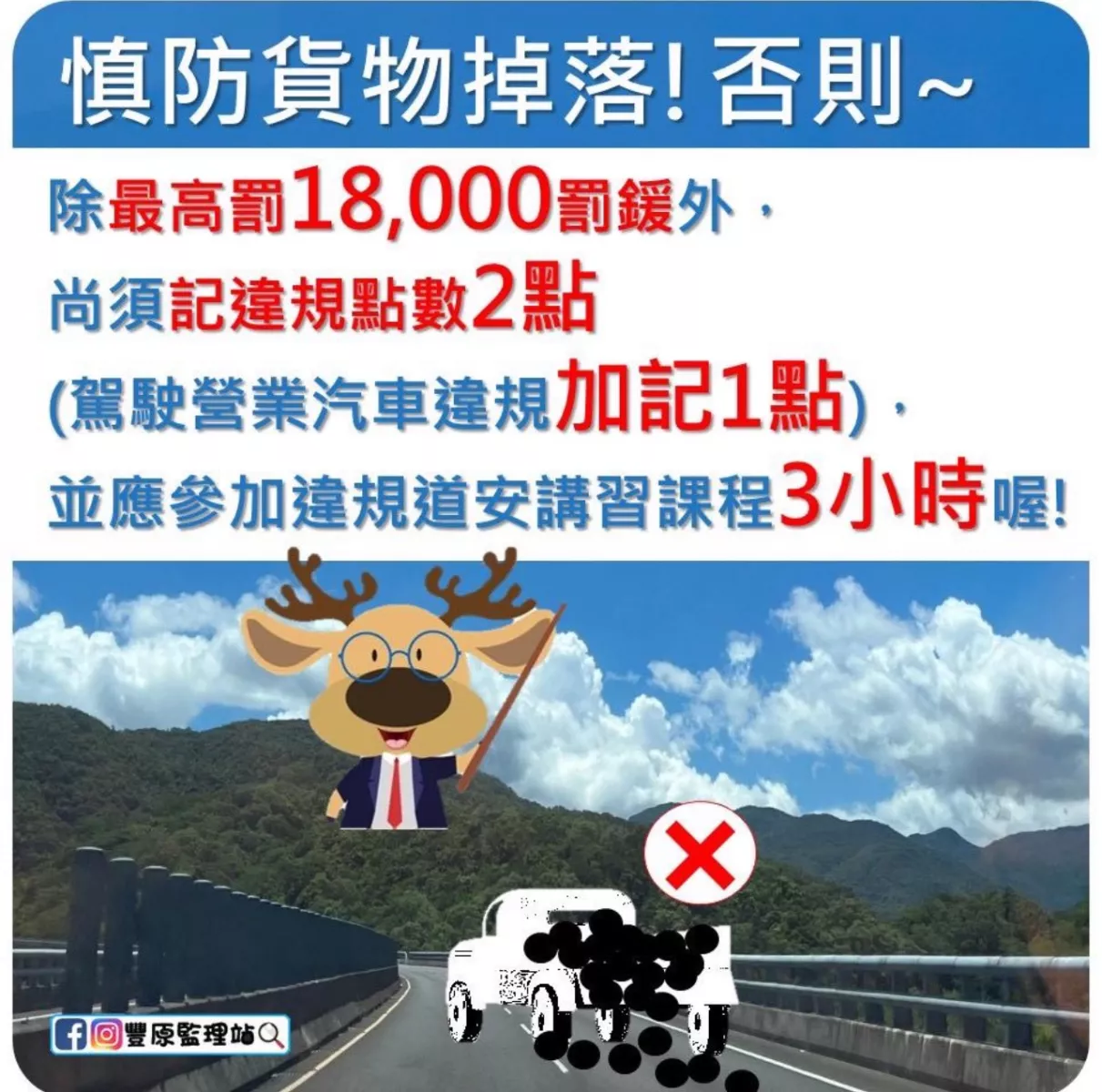 ⚠️⚠️裝載貨物不穩妥,造成貨物滲漏、飛散、脫落及掉落等,除違反法規規範外,還可能會導致交通事故,對道路使用者造成危害。