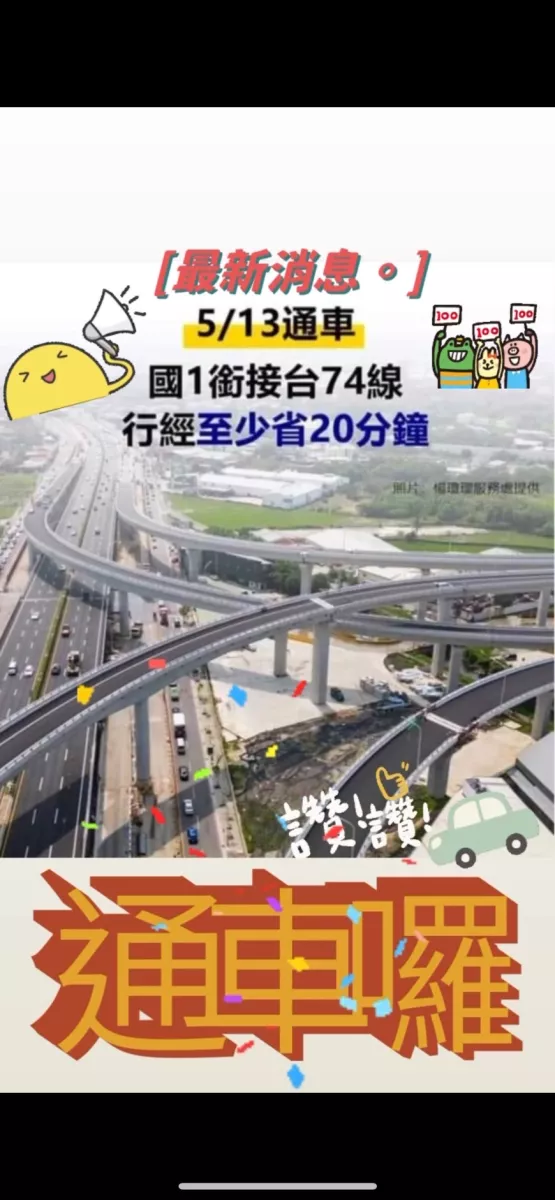 一定要報您知!📢國1銜接台74線交流道,通車囉❗❗