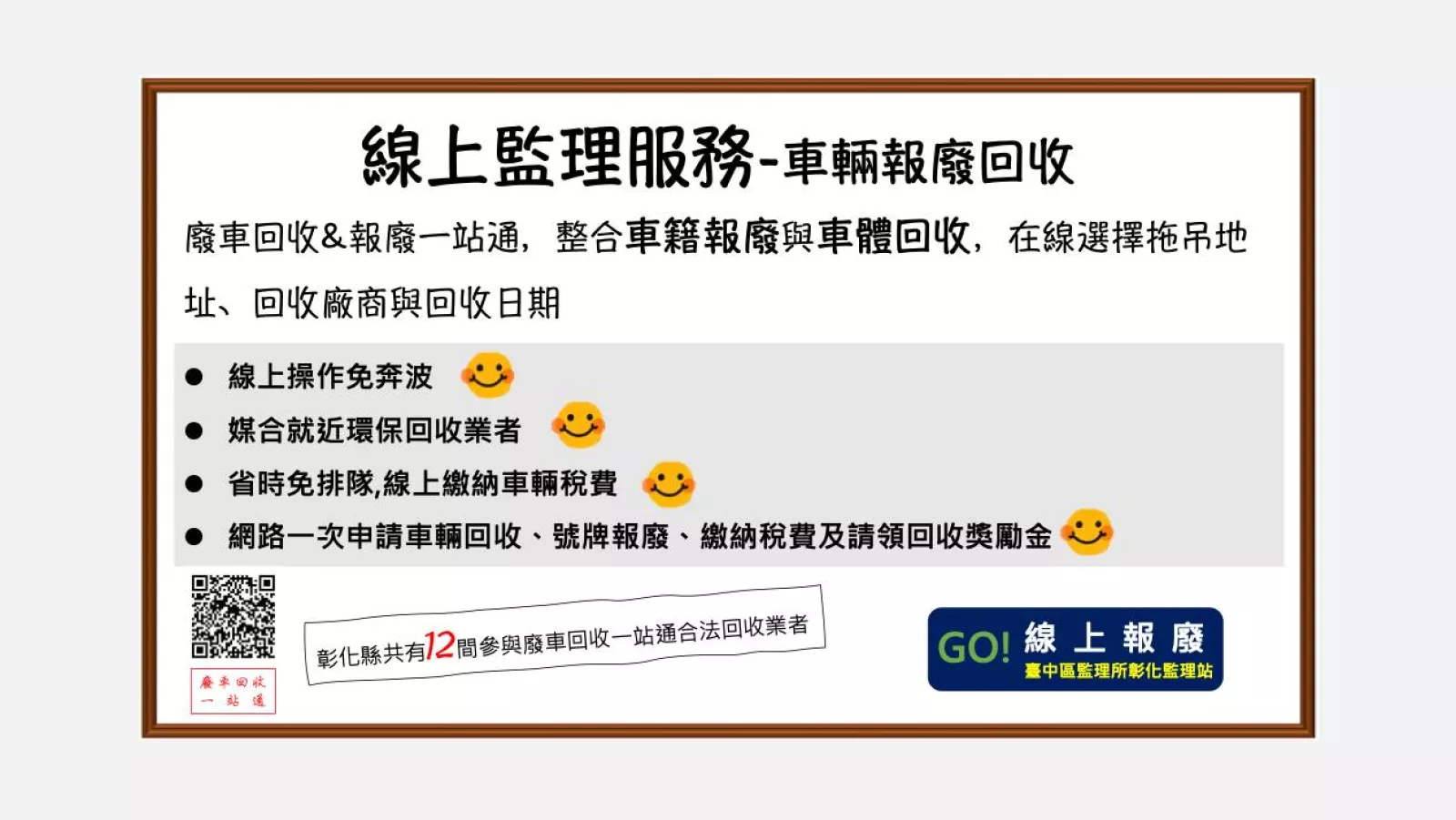彰化計有12家配合廢車回收一站通,請多多運用,節省寶貴的時間。