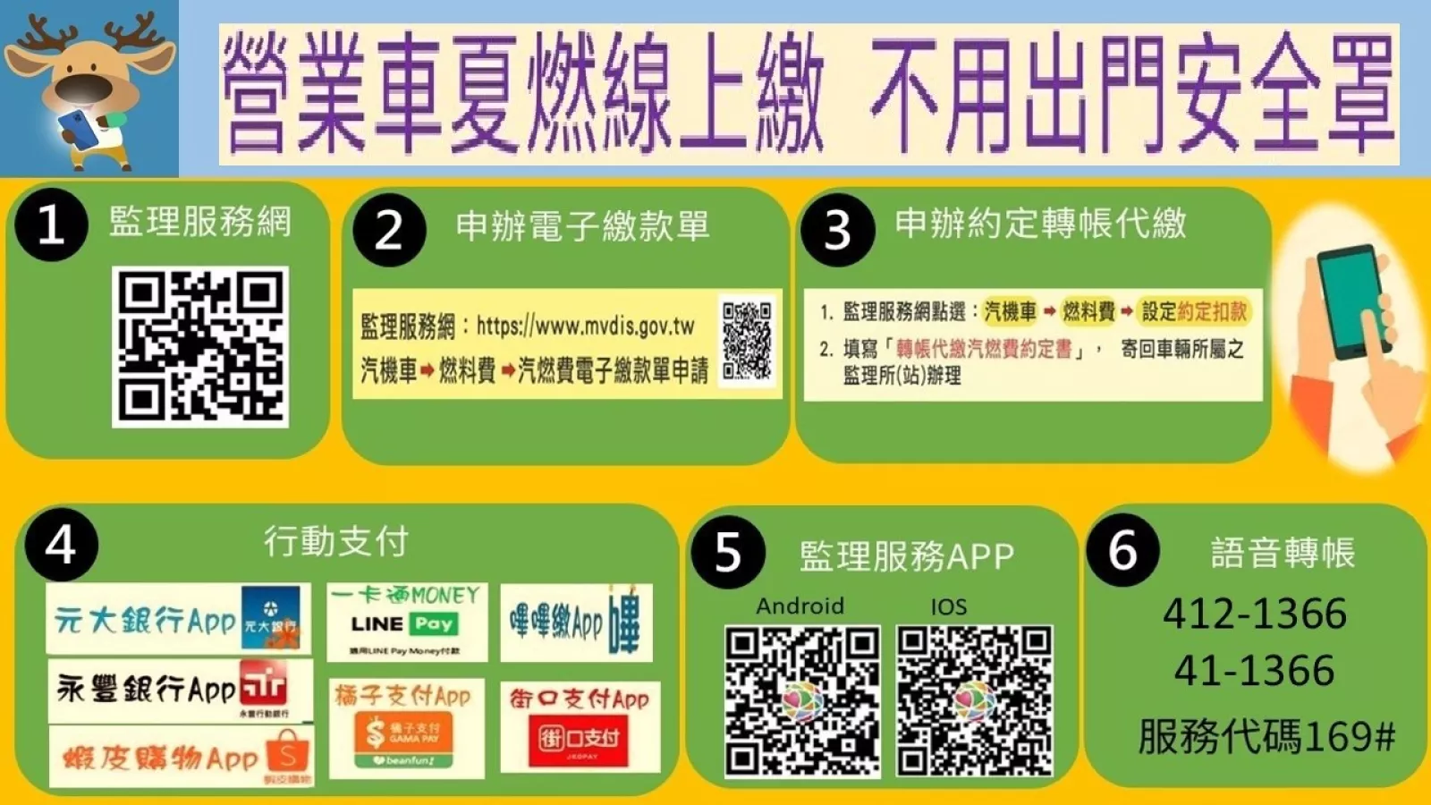 或利用監理服務網、監理服務APP或撥打語音電話(412-1366,服務代碼169#),