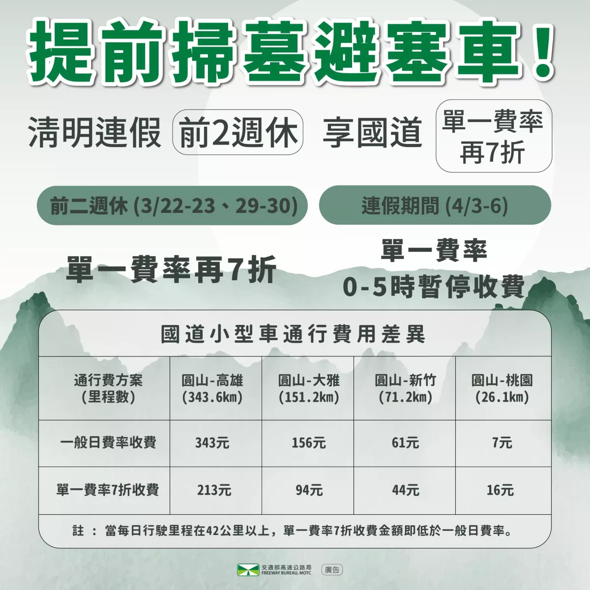 提前掃墓省時、省錢、避塞車🚗💨連假前2週休國道通行費享優惠❗️