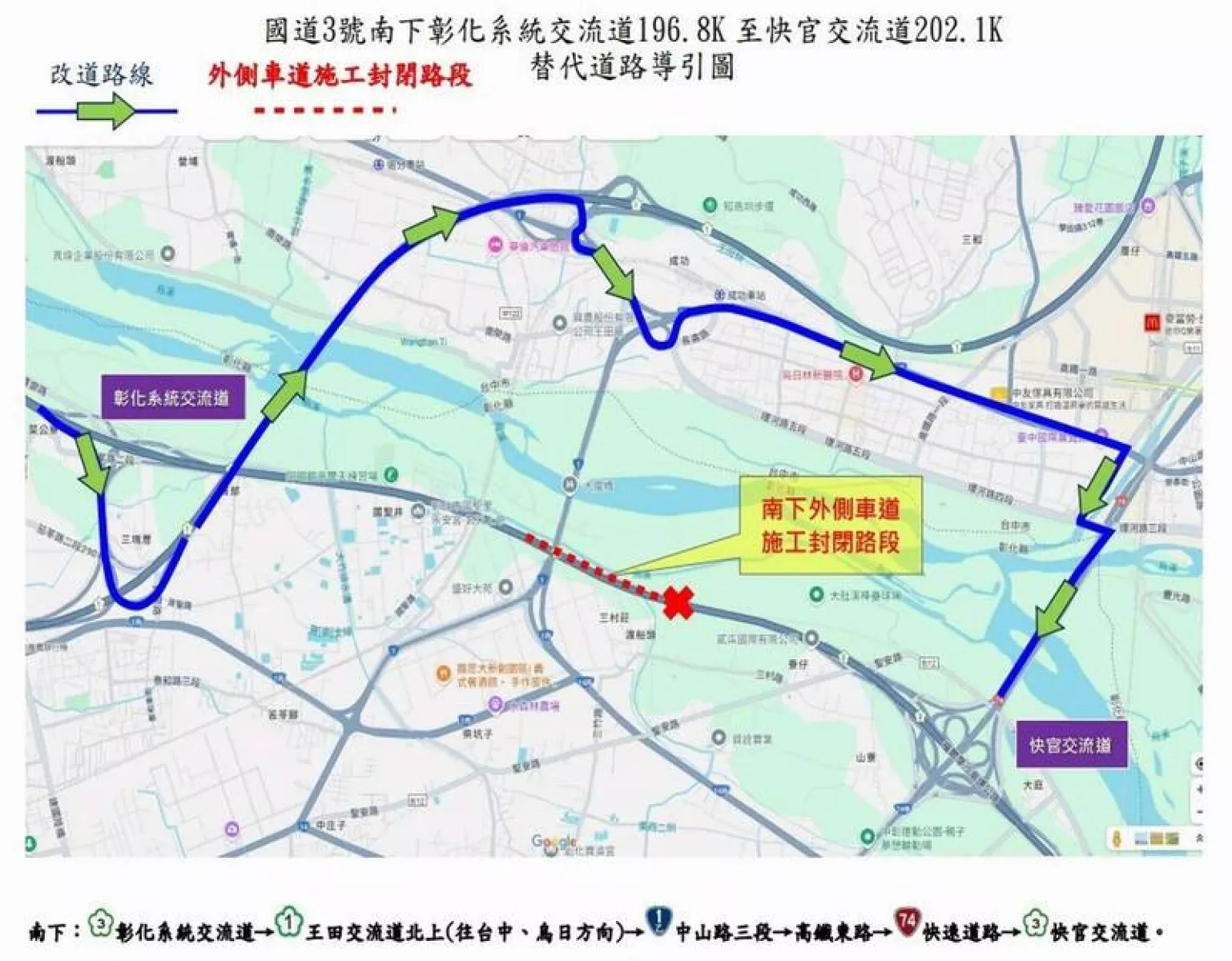 施工期間行經該路段用路人,可利用改道路線,避開壅塞路段。