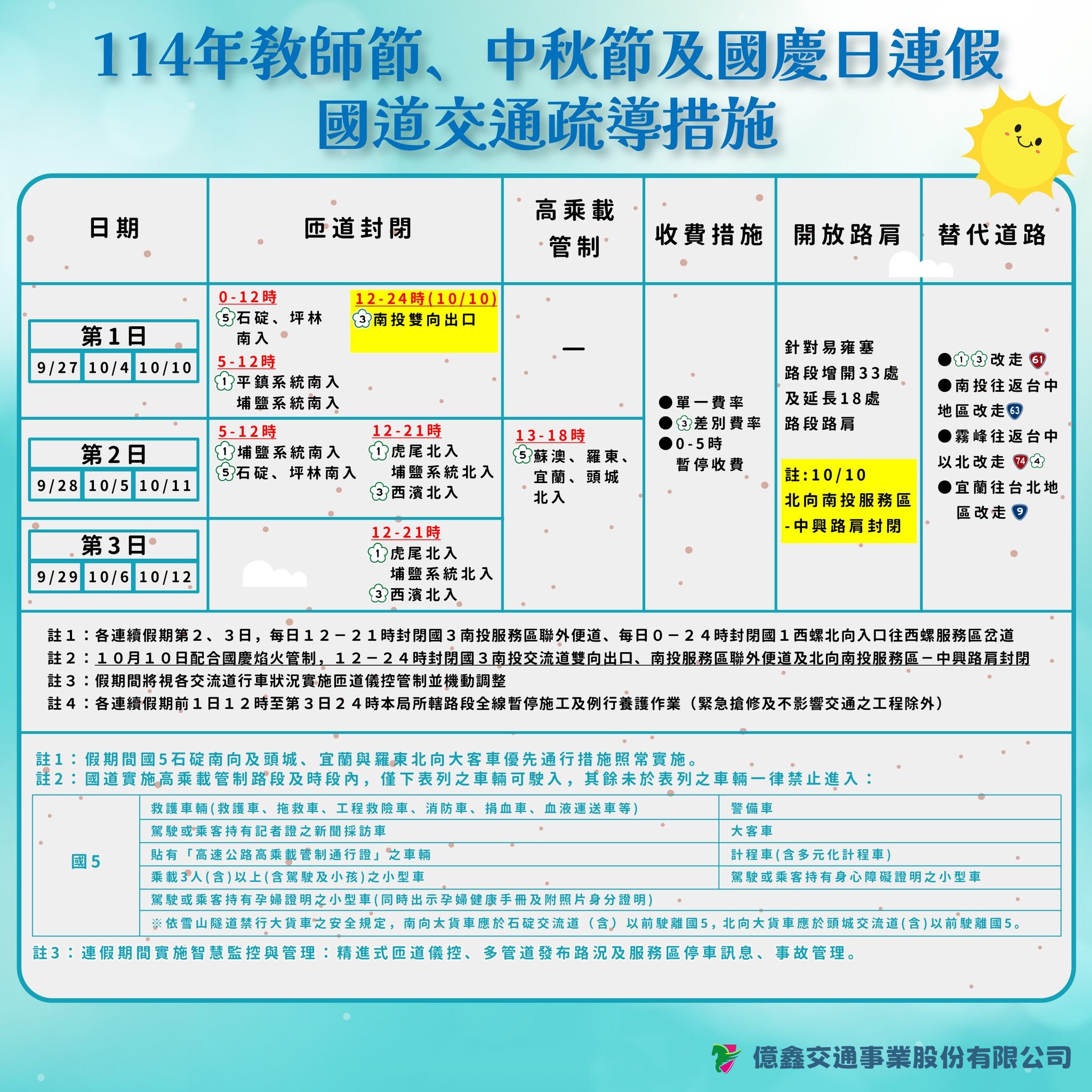 🎉 114年「中秋節、教師節、國慶日」連假,國道交通疏導措施出爐囉❗