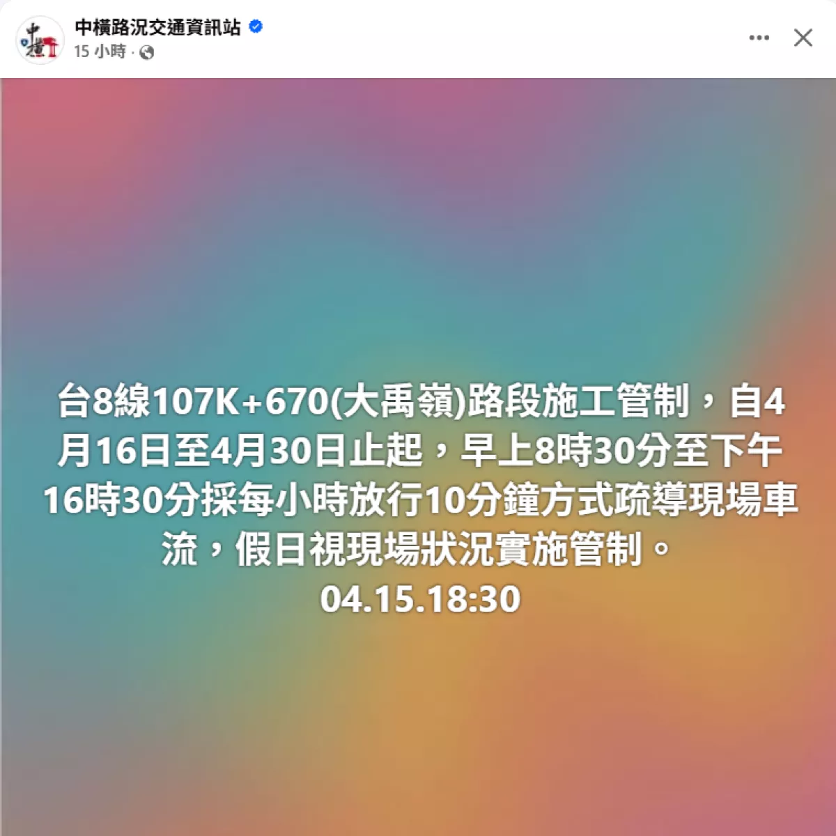 來來來~小編報乎哩災👉台8線(大禹嶺)路段施工管制,