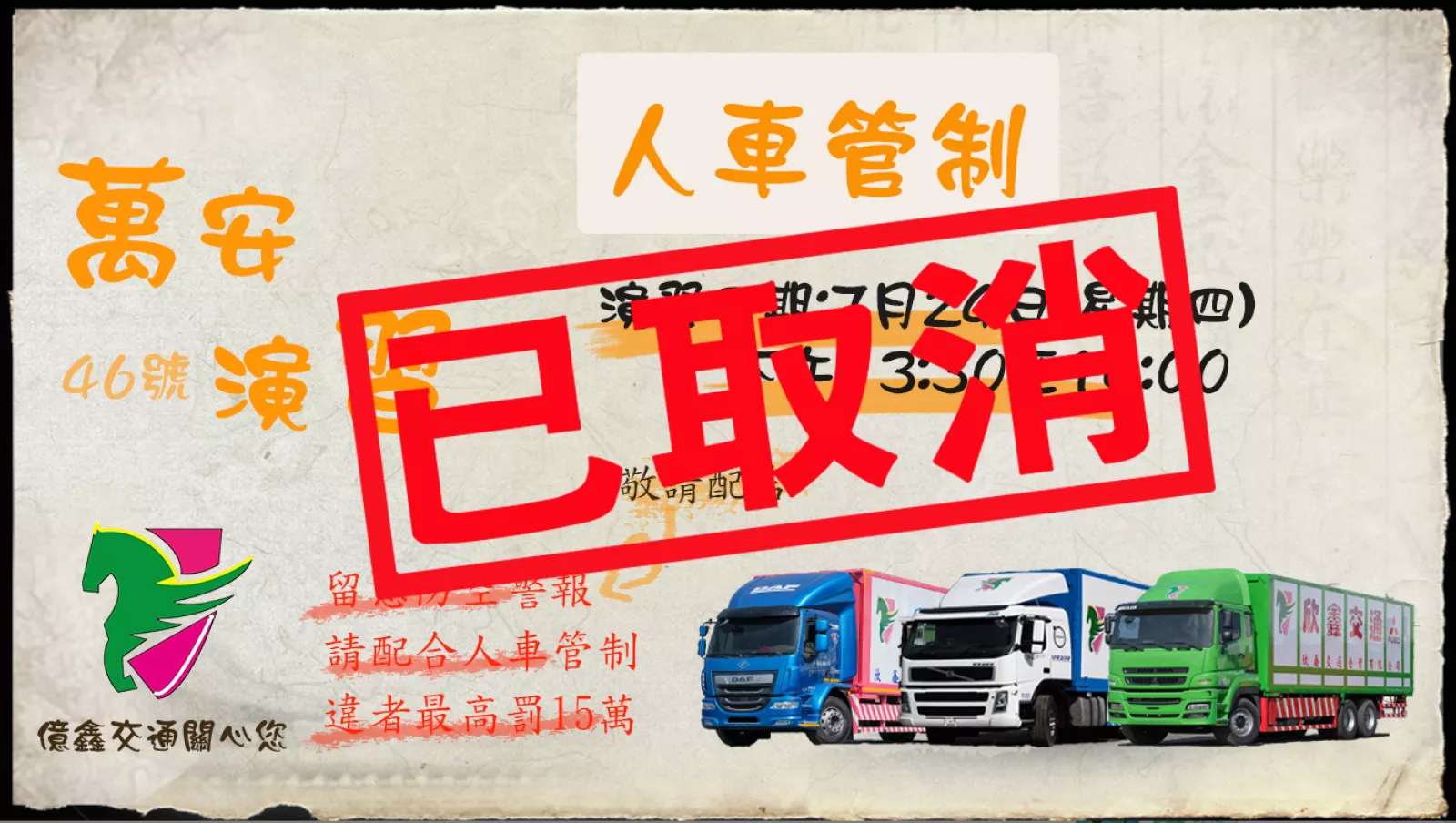 原定112年7月27日46號萬安演習 取消