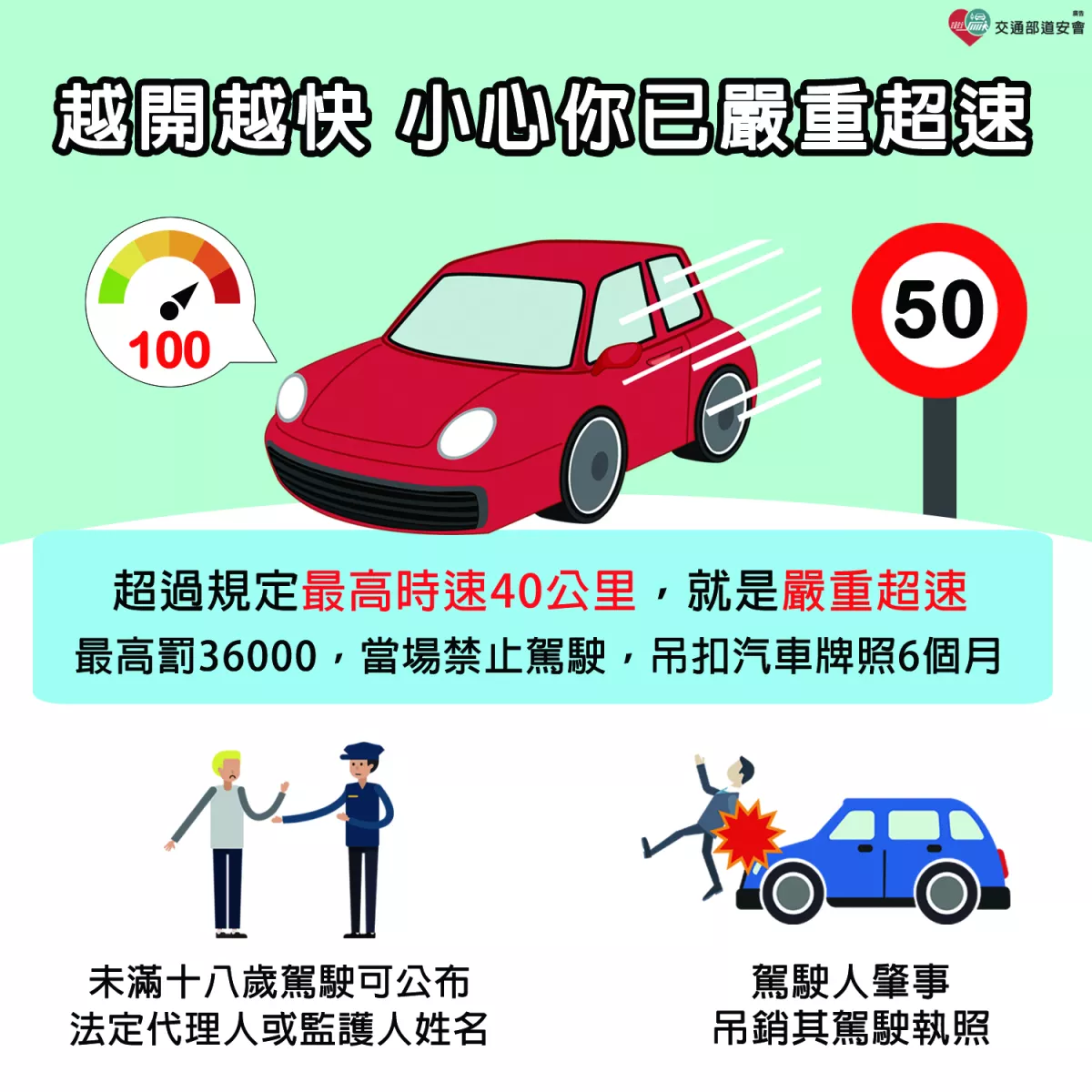 🚗嚴重超速 危險必罰📣提醒駕駛人👉超過規定最高時速40公里,就是嚴重超速最高罰新台幣3萬6000元,當場禁止駕駛,吊扣牌照6個月!