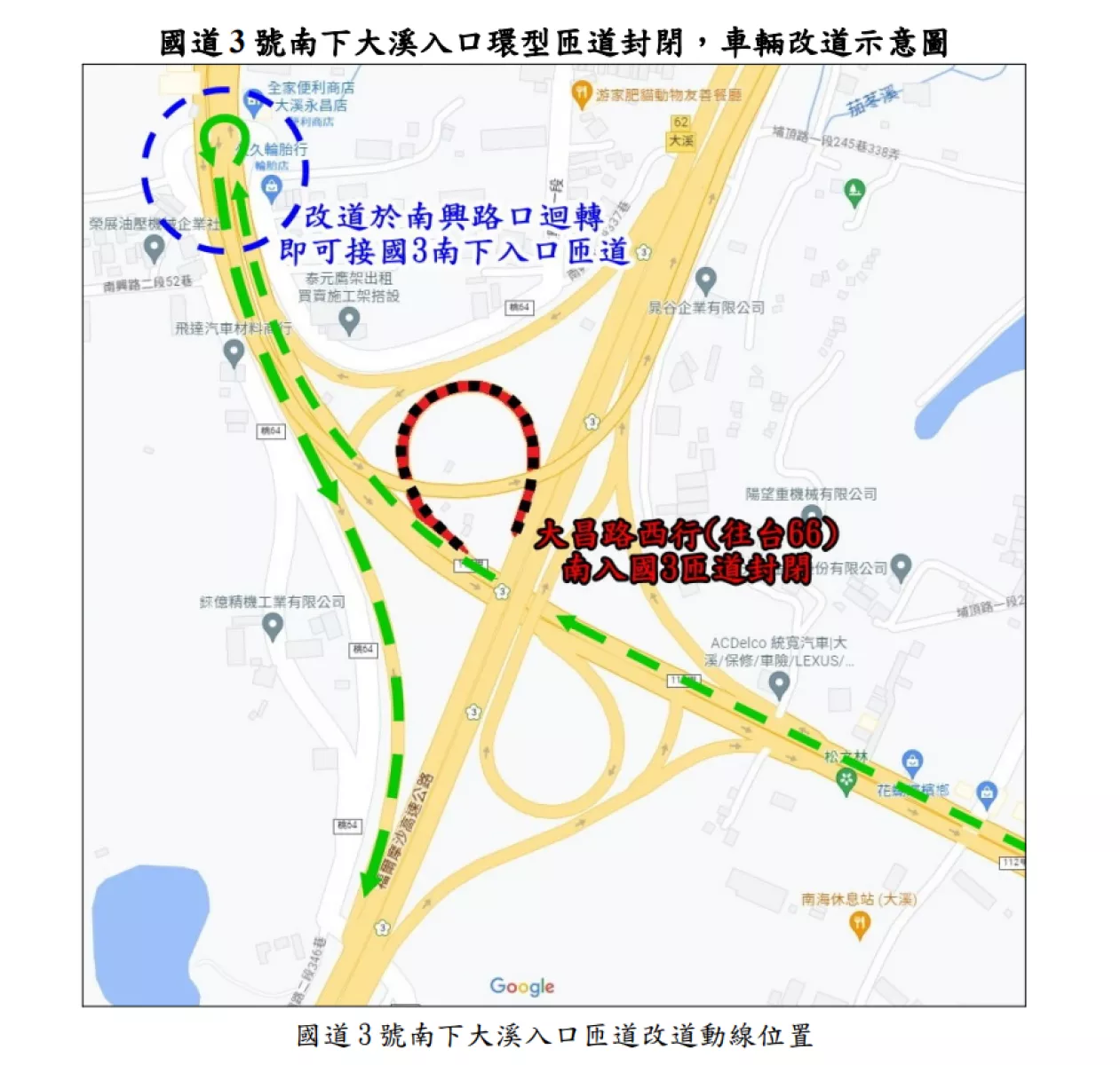 大昌路(112甲線)西行往台66線方向,欲使用國道3號南下之用路人,建議請於封閉之入口環型匝道後方400公尺(南興路口)處,左迴轉,行駛大昌路(112甲線)東行往台3線方向即可接國道3號大溪南入匝道。